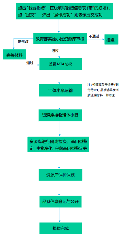 3.教育部实验小鼠资源库审核,2个工作日内回复邮件或电话联系。审核不通过,则不接受捐赠。材料不全的,需完善材料。